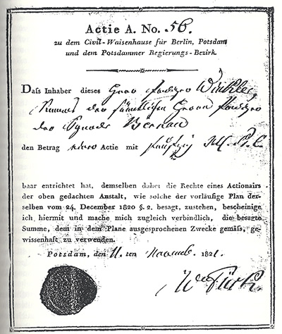 Das »Grundgesetz für das am 1. Januar 1822 eröffnete Civil-Waisenhaus zu Potsdam« – die Statuten sozusagen – wurden auf der ersten Stiftungsversammlung beschlossen und am 21. Februar 1825 vom preußischen König Friedrich Wilhelm III. bestätigt.